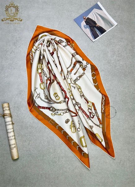 Khăn Hermes 90*90 les chevaux dechaines IL / creme / orange cuit